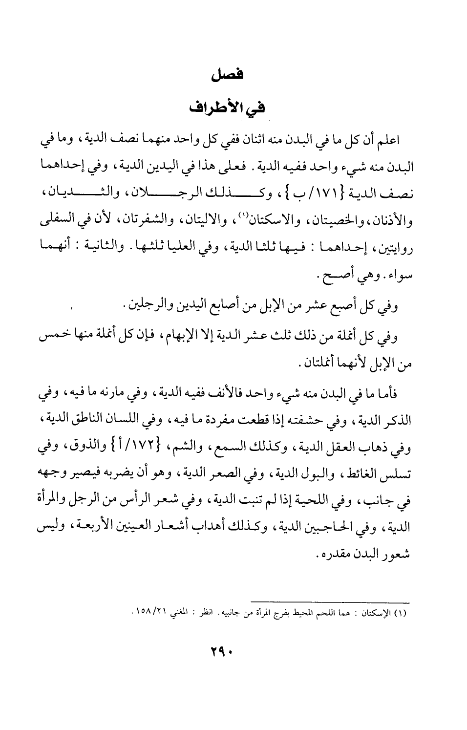 اعلم أن كل ما في البدن منه اثنان ففي كل واحد منهما نصف الدية، وما في البدن منه شيء واحد ففيه الدية. فعلى هذا في اليدين الدية، وفي إحداهما نصف الدية {171/ب}، وكذلك الرجلان، والثديان، والأذنان، والخصيتان، والاسكتان (¬1)، والاليتان، والشفرتان، لأن في السفلى روايتين، إحداهما: فيها ثلثا الدية، وفي العليا ثلثها. والثانية: أنهما سواء. وهي أصح.