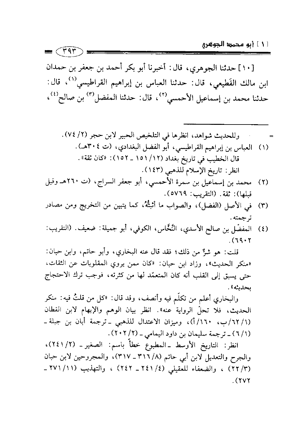 10- حدثنا الجوهري قال أخبرنا أبو بكر أحمد بن جعفر بن حمدان بن مالك القطيعي قال حدثنا العباس بن إبراهيم القراطيسي قال: حدثنا محمد بن إسماعيل الأحمسي قال حدثنا المفضل بن صالح -[394]- عن أبي إسحاق عن حنش الكناني قال سمعت أبا ذر رضي الله عنه -[395]- يقول وقد أخذ بباب الكعبة من عرفني فأنا من قد عرفني ومن أنكرني فأنا أبو ذر سمعت النبي صلى الله عليه وسلم يقول: " ألا إن مثل أهل بيتي فيكم مثل سفينة نوح من ركبها نجا ومن تخلف عنها هلك ".