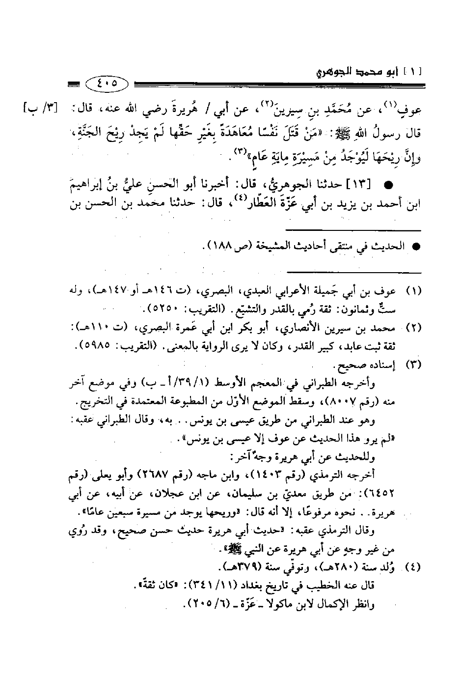 13- حدثنا الجوهري قال أخبرنا أبو الحسن علي بن إبراهيم بن أحمد بن يزيد بن أبي عزة العطار قال حدثنا محمد بن الحسن بن -[406]- بدينا الدقاق سنة ثلاثمائة قال حدثنا أبو فروة يزيد بن محمد بن سنان الرهاوي قال حدثني أبي عن جدي عن عطاء بن أبي رباح قال سمعت مجاهدا يقول سمعت سعيد بن المسيب يقول: سمعت -[407]- صهيبا رضي الله عنه يقول: سمعت النبي صلى الله عليه وسلم يقول: " ما آمن بالقرآن من استحل محارمه ".