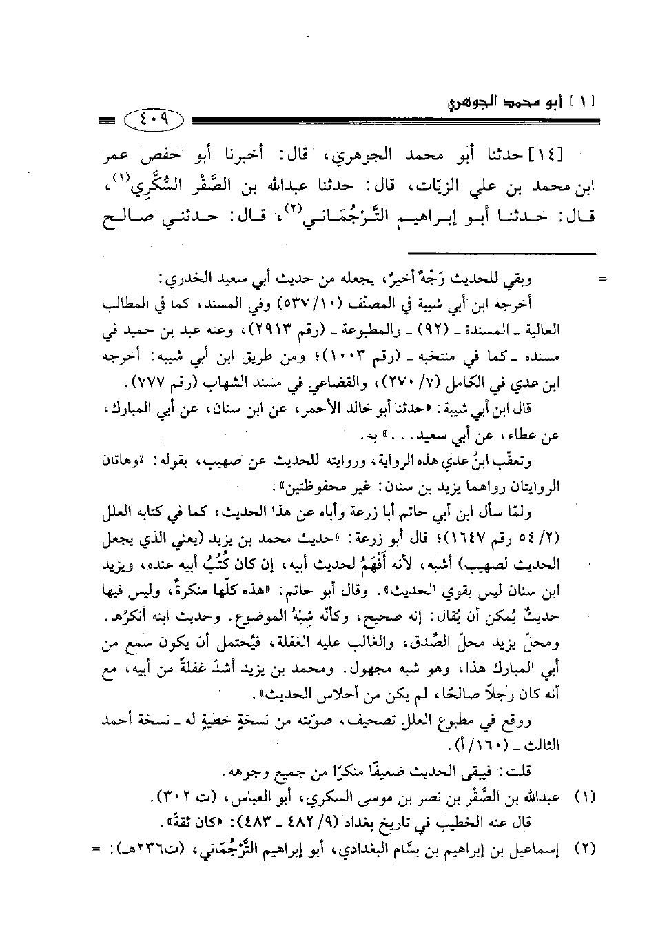 14- حدثنا أبو محمد الجوهري قال: أخبرنا أبو حفص عمر بن محمد بن علي الزيات قال حدثنا عبد الله بن الصقر السكري قال حدثنا أبو إبراهيم الترجماني قال حدثني صالح -[410]- المري قال حدثني أبو عمران الجوني قال: " قال الله عز وجل أنا مالك الملوك قلوب الملوك ونواصيها بيدي. فمن أعطاعني جعلتهم عليه رحمة ومن عصاني جعلتهم عليه نقمة. فلا تشغلوا أنفسكم بسب الملوك توبوا إلي أعطفهم عليكم ".