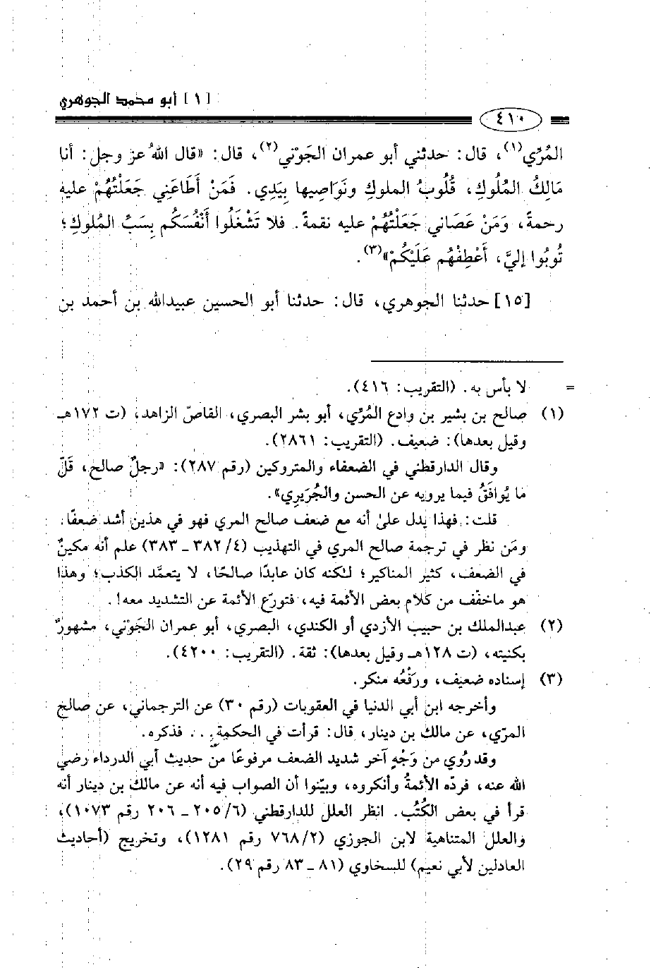 15- حدثنا الجوهري قال حدثنا أبو الحسين عبيد الله بن أحمد بن -[411]- يعقوب المقرئ قال حدثنا العباس بن علي النسائي قال حدثنا الزبير بن بكار قال حدثنا مطرف عن مالك قال قال لي أمير المؤمنين هارون رضي الله عنه يا مالك كيف كان منزلة أبي بكر وعمر من النبي صلى الله عليه وسلم قال: قلت: يا أمير المؤمنين قربهما منه في حياته كقرب مضجعهما من مضجعه بعد وفاته. فقال: شفيتني يا مالك شفيتني يا مالك.