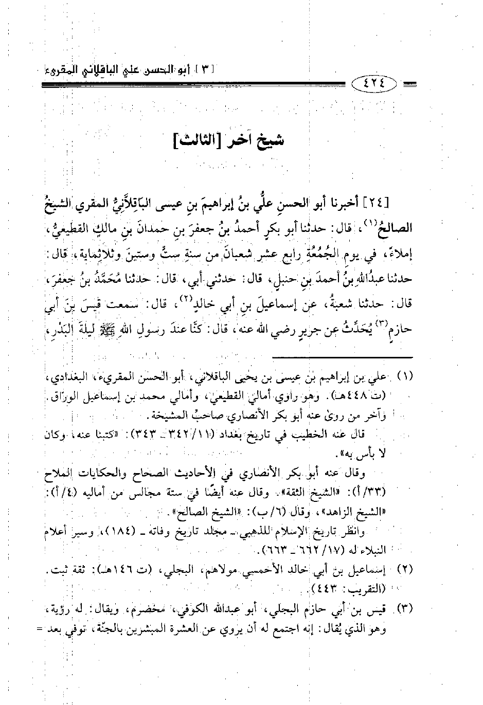 24- أخبرنا أبو الحسن علي بن إبراهيم بن عيسى الباقلاني المقري الشيخ الصالح قال حدثنا أبو بكر أحمد بن جعفر بن حمدان بن مالك القطيعي إملاء في يوم الجمعة رابع عشر شعبان من سنة ست وستين وثلاثمائة قال: حدثنا عبد الله بن أحمد بن حنبل قال حدثني أبي قال حدثنا محمد بن جعفر قال حدثنا شعبة عن إسماعيل بن أبي خالد قال سمعت قيس بن أبي حازم يحدث عن جرير رضي الله عنه قال كنا عند رسول الله صلى الله عليه وسلم ليلة البدر -[425]- فقال: " إنكم سترون ربكم عز وجل كما ترون القمر لا تضامون في رؤيته فإن استطعتم أن لا تغلبوا على هاتين الصلاتين قبل طلوع الشمس وقبل غروبها، ثم تلا هذه الآية (وسبح بحمد ربك قبل طلوع الشمس وقبل الغروب) .
