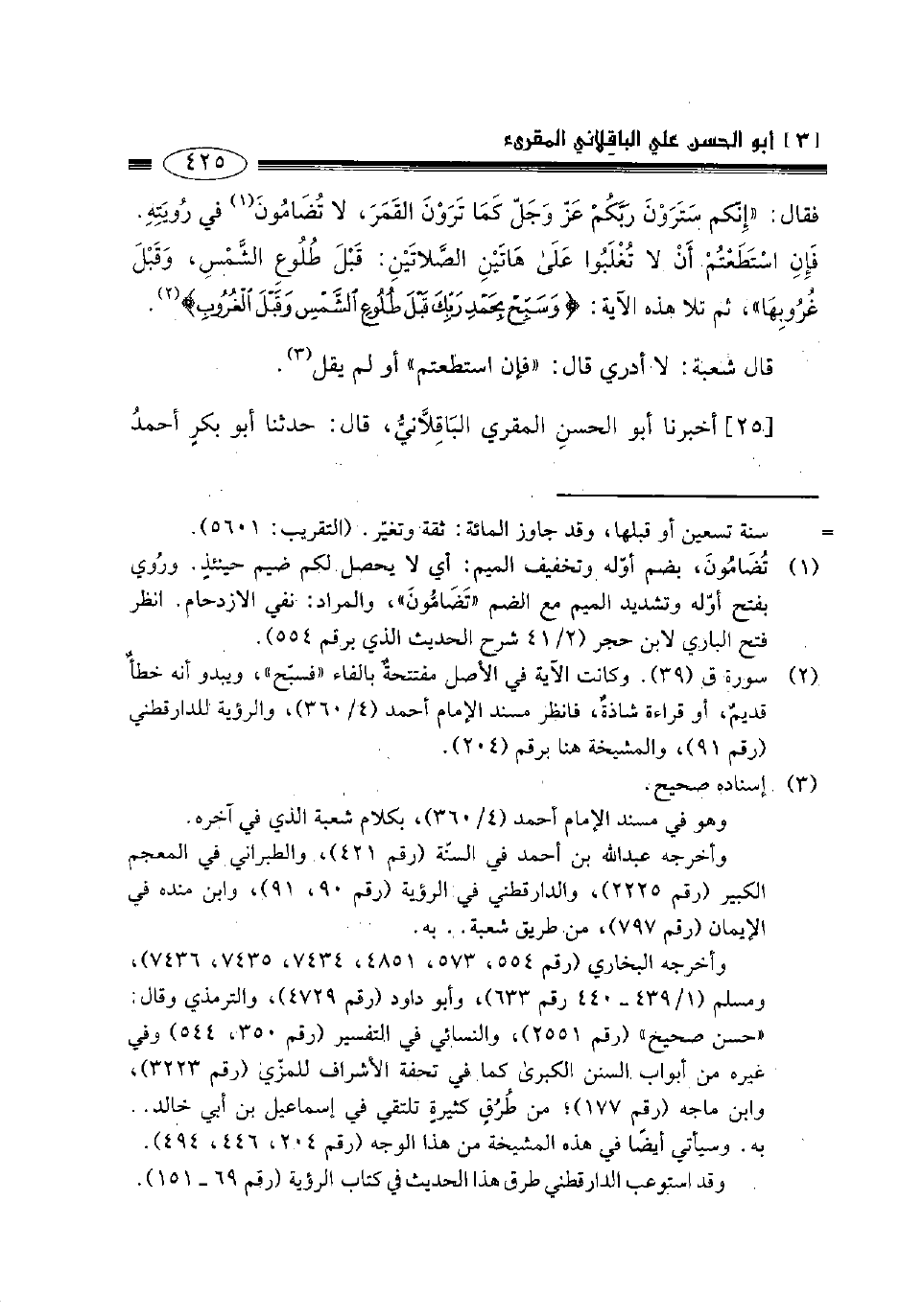 25- أخبرنا أبو الحسن المقري الباقلاني قال حدثنا أبو بكر أحمد -[426]- بن جعفر بن حمدان القطيعي قال حدثنا عبد الله بن أحمد بن حنبل قال: حدثني أبي قال حدثنا الضحاك بن مخلد قال أخبرنا عبد الحميد بن جعفر قال حدثني يزيد بن أبي حبيب عن عمرو بن الوليد عن عبد الله بن عمرو أن رسول الله صلى الله عليه وسلم قال: " من قال علي ما لم أقل فليتبوأ -[427]- مقعده من جهنم " قال: وسمعت رسول الله صلى الله عليه وسلم يقول: " إن الله عز وجل حرم الخمر والميسر والكوبة والغبيرا وكل مسكر حرام ".