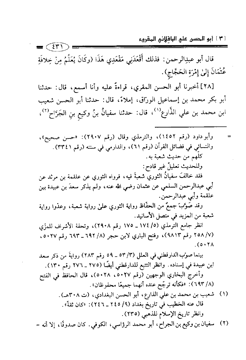 28- أخبرنا أبو الحسن المقري قراءة عليه وأنا أسمع قال حدثنا أبو بكر محمد بن إسماعيل الوراق إملاء قال حدثنا أبو الحسن شعيب بن محمد بن علي الذراع قال حدثنا سفيان بن وكيع بن الجراح قال -[432]- حدثنا جرير بن عبد الحميد عن الأعمش عن أبي صالح عن أبي هريرة قال: قال رسول الله صلى الله عليه وسلم: " إذا قرأ ابن آدم السجدة اعتزل إبليس يبكي ويقول: يا ويله! أمر ابن آدم بالسجود فسجد فله الجنة وأمرت بالسجود فعصيت فلي النار ".