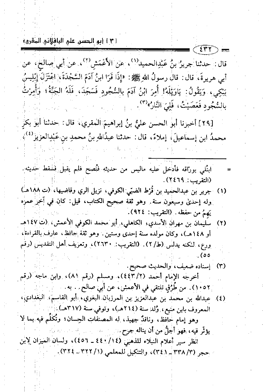 -[434]- قال محمد بن إسماعيل: هذا إسناد غريب، لا أعلم رواه غير روح بن عبادة حدث به الإمام أحمد بن حنبل رضي الله عنه.