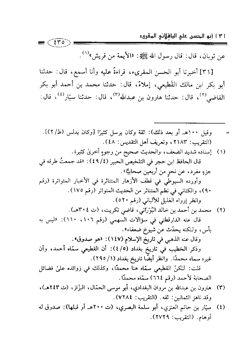 31- أخبرنا أبو الحسن المقرئ قراءة عليه وأنا أسمع قال حدثنا أبو بكر ابن مالك القطيعي إملاء قال حدثنا محمد بن أحمد أبو بكر القاضي قال حدثنا هارون بن عبد الله قال حدثنا سيار قال: -[436]- حدثنا قدامة بن أيوب العتكي وكان من أصحاب عتبة، قال رأيت عتبة الغلام في المنام فقلت: يا أبا عبد الله ما صنع الله بك؟ قال: يا قدامة دخلت الجنة بتلك الدعوات المكتوبة في بيتك. فلما أصبحت جئت إلى بيتي فإذا بخط عتبة في الحائط: يا هادي المضلين وياراحم المذنبين ويامقيل عثرات العاثرين ارحم عبدك ذا الخطر العظيم والمسلمين كلهم أجمعين واجعلنا من الأحياء المرزوقين الذين أنعمت عليهم من النبيين والصديقين والشهداء والصالحين وحسن أولئك رفيقا آمين رب العالمين ".