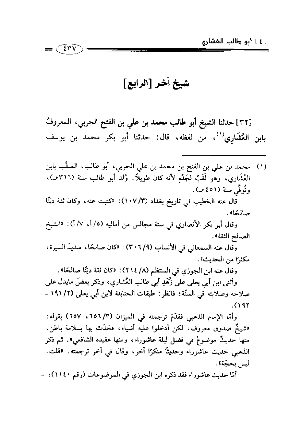 32- حدثنا الشيخ أبو طالب محمد بن علي بن الفتح الحربي المعروف بابن العشاري من لفظه قال حدثنا أبو بكر محمد بن يوسف -[438]- العلاف في سنة سبع وسبعين وثلاثمائة قال حدثنا أبو القاسم عبد الله -[439]- بن محمد البغوي قال حدثنا هدبة بن خالد قال حدثنا أبان بن يزيد قال حدثنا يحيى بن أبي كثير أن أبا قلابة حدثه أن ثابت بن الضحاك حدثه أن رسول الله صلى الله عليه وسلم قال: " من حلف على ملة غير -[440]- الإسلام كاذبا فهو كما قال. ليس على رجل نذر فيما لا يملك ".