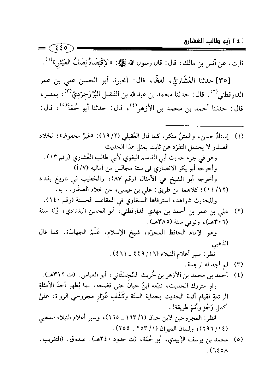 35- حدثنا العشاري لفظا قال أخبرنا أبو الحسن علي بن عمر الدارقطني قال حدثنا محمد بن عبد الله بن الفضل البروجردي بمصر قال حدثنا أحمد بن محمد بن الأزهر قال حدثنا أبو حمة قال: -[446]- حدثنا أبو قرة عن مالك بن أنس عن زياد بن سعد عن أبي الزبير عن جابر وعبيد بن عمير قالا: قال رسول الله صلى الله عليه وسلم: " أفضل الصدقة جهد المقل ".