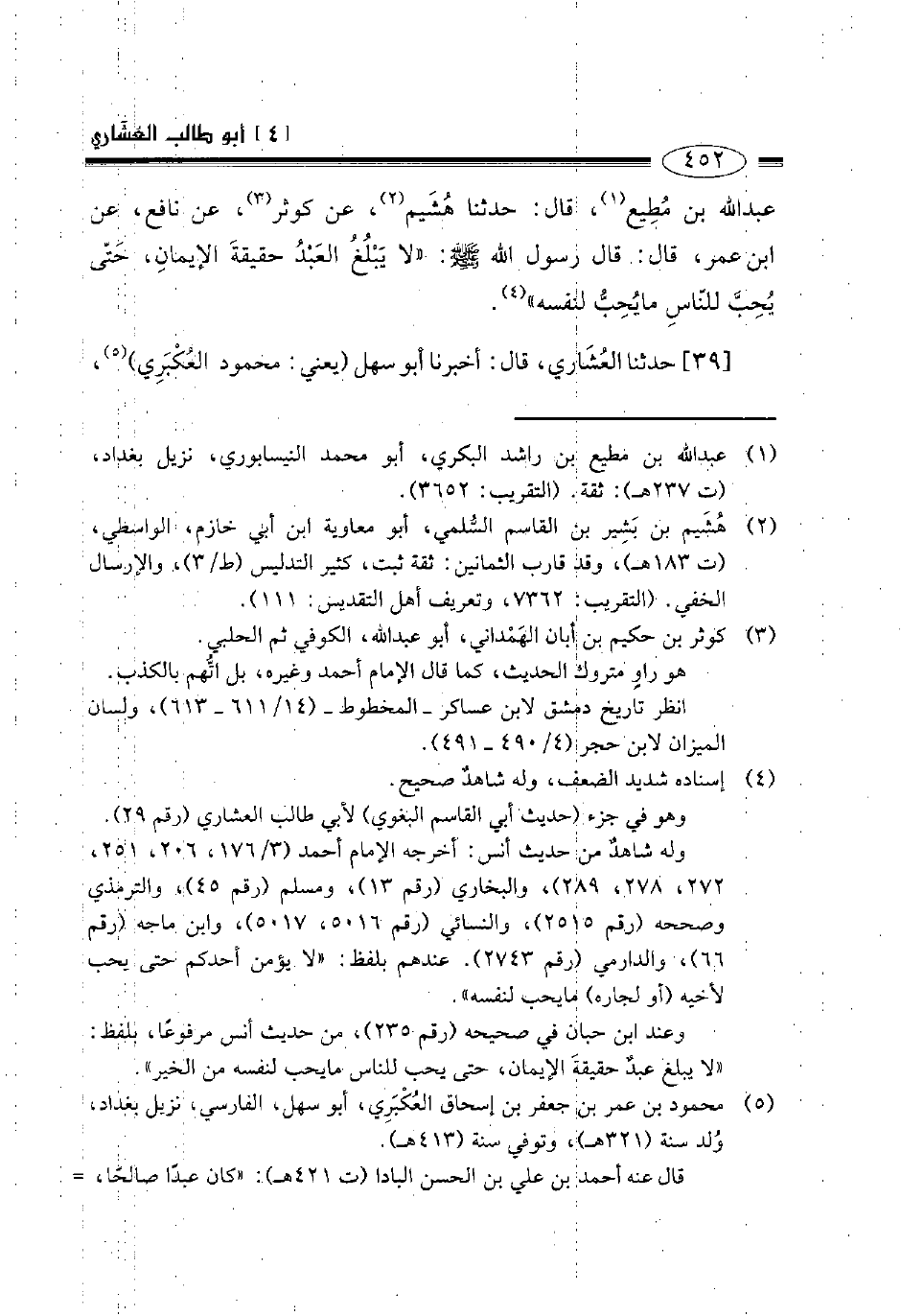 39- حدثنا العشاري قال أخبرنا أبو سهل – يعني محمود العكبري – -[453]- قال أنبأنا جعفر بن محمد الصوفي قال حدثنا أحمد بن محمد بن مسروق قال حدثنا محمد بن الحسين قال حدثني حكيم بن جعفر عن مسمع -[454]- قال كان أصحابنا عامتهم فقراء فكنت ربما رأيت عبد العزيز يخرج بالكسرة والتمر والشيء لعله يكون قد منعه أهله وولده فيقسمه على إخوانه كسرة كسرة وقطعة تمر قطعة قطعة وربما رأيته يعطيهم فلسا فلسا ويقول: بأبي أنتم رأيتم الصبر على الفقر أيسر من معالجة الأنكال والأغلال غدا في النار.