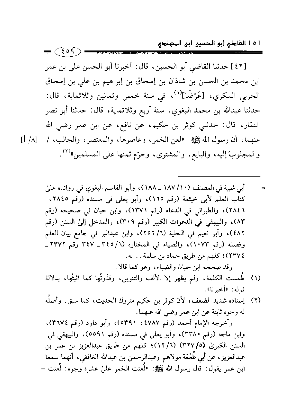 42- حدثنا القاضي أبو الحسين قال أخبرنا أبو الحسن علي بن عمر بن محمد بن الحسن بن شاذان بن إسحاق بن إبراهيم بن علي بن إسحاق الحربي السكري عرضا في سنة خمس وثمانين وثلاثمائة قال حدثنا عبد الله بن محمد البغوي سنة أربع وثلاثمائة قال حدثنا أبو نصر التمار قال حدثني كوثر بن حكيم عن نافع عن ابن عمر رضي الله عنهما أن رسول الله صلى الله عليه وسلم: " لعن الخمر وعاصرها والمعتصر والجالب والمجلوب إليه والبايع والمشتري وحرم ثمنها على المسلمين ".