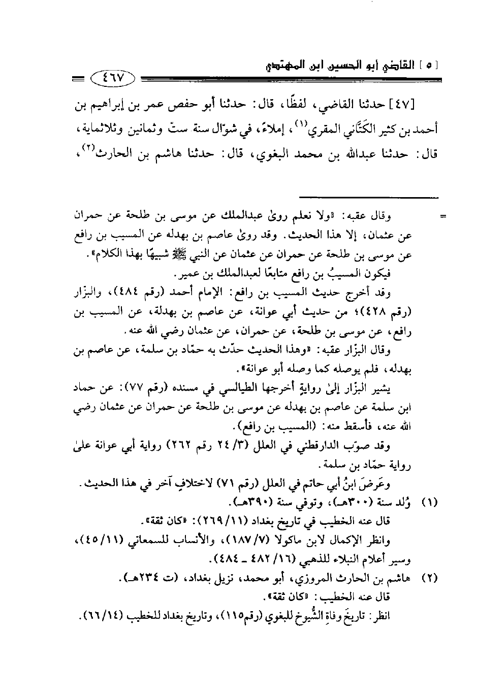 47- حدثنا القاضي لفظا قال حدثنا أبو حفص عمر بن إبراهيم بن أحمد بن كثير الكتاني المقرئ إملاء في شوال سنة ست وثمانين وثلاثمائة قال: حدثنا عبد الله بن محمد البغوي قال: حدثنا هاشم بن الحارث -[468]- قال حدثنا عبيد الله بن عمرو عن زيد بن أبي أنيسة عن الحكم عن نافع عن ابن عمر رضي الله عنهما قال: قال رسول الله صلى الله عليه وسلم: " من أتى الجمعة فليغتسل ".