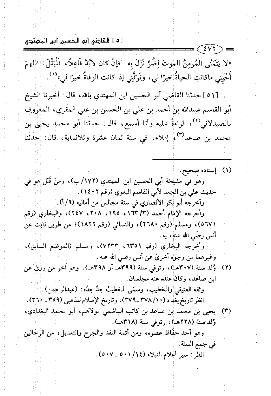 51- حدثنا القاضي أبو الحسين ابن المهتدي بالله قال أخبرنا الشيخ أبو القاسم عبيد الله بن أحمد بن علي بن الحسين بن علي المقرئ المعروف بالصيدلاني قراءة عليه وأنا أسمع قال حدثنا أبو محمد يحيى بن محمد بن صاعد إملاء في سنة ثمان عشرة وثلاثمائة قال حدثنا -[473]- يحيى بن سليمان بن نضلة الخزاعي بالمدينة سنة خمس وأربعين ومائتين قال حدثني سليمان بن بلال عن موسى بن أنس عن أنس بن مالك رضي الله عنه: أن النبي صلى الله عليه وسلم عاد رجلا من المسلمين فدخل عليه وهو كالفرخ المنتوف جهدا فقال له: " ما كنت تدعو بشيء وتسله؟ " قال: نعم، كنت أقول: اللهم ما كنت معاقبي به في الآخرة فعجله لي في الدنيا! فقال النبي صلى الله عليه وسلم: " لا تطيقه ولا تستطيعه فهلا قلت: اللهم آتني في الدنيا حسنة وفي الآخرة حسنة وقني عذاب النار ".