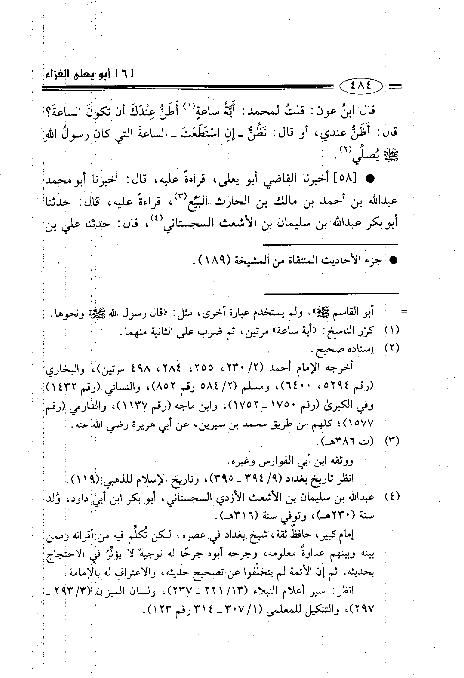 58- أخبرنا القاضي أبو يعلى قراءة عليه قال: أخبرنا أبو محمد عبد الله بن أحمد بن مالك بن الحارث البيع قراءة عليه قال حدثنا أبو بكر عبد الله بن سليمان بن الأشعث السجستاني قال حدثنا علي بن -[485]- خشرم قال حدثنا عيسى يعني ابن يونس عن ابن جريج قال أخبرني عمرو بن دينار عن سعيد بن جبير عن ابن عباس رضي الله عنهما قال: أقبل رجل حرام مع النبي صلى الله عليه وسلم فخر من بعيره فوقص وقصا فمات فقال رسول الله صلى الله عليه وسلم: " اغسلوه بماء وسدر وألبسوه ثوبيه ولا تخمروا رأسه فإنه يأتي يوم القيامة يلبي ".