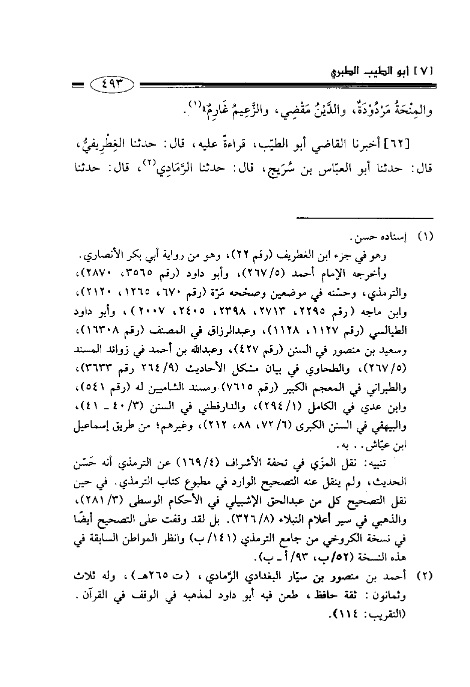 62- أخبرنا القاضي أبو الطيب قراءة عليه قال حدثنا الغطريفي قال حدثنا أبو العباس بن سريج قال حدثنا الرمادي قال حدثنا -[494]- عبد الرزاق قال أخبرنا معمر عن الزهري عن أبي سلمة عن جابر قال كان النبي صلى الله عليه وسلم لا يصلي على رجل عليه دين فأتي بميت عليه دين فقال: " صلوا على صاحبكم ". فقال أبو قتادة: هو علي يا رسول الله فصلى عليه. فلما فتح الله الفتوح قال: " أنا أولى بالمؤمنين من ترك دينا فعلي ومن ترك مالا فلورثته ".