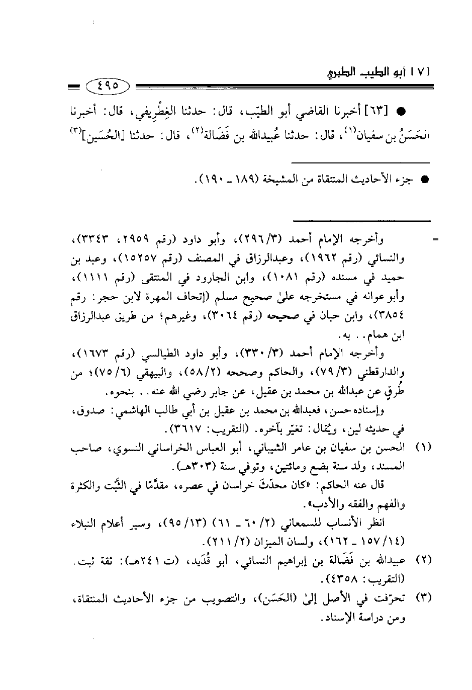 63- أخبرنا القاضي أبو الطيب قال حدثنا الغطريفي قال أخبرنا الحسن بن سفيان قال حدثنا عبيد الله بن فضالة قال حدثنا [الحسين]-[496]- بن الوليد قال حدثنا سليمان بن أرقم عن الزهري عن سعيد بن المسيب عن عثمان بن عفان رضي الله عنه عن النبي صلى الله عليه وسلم قال: " الصبحة تمنع الرزق " يعني: نوم الغداة.
