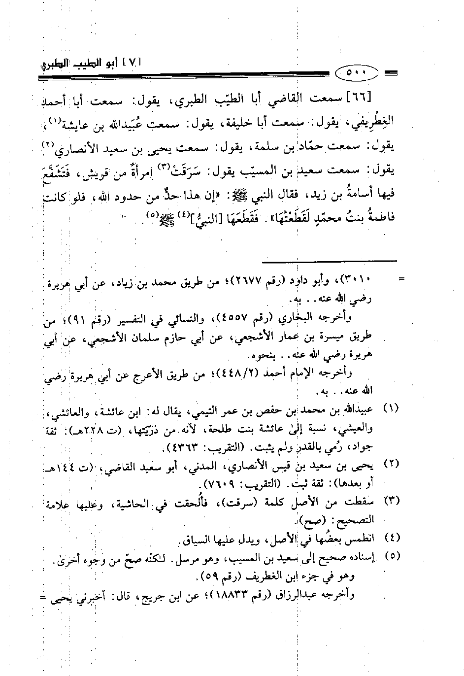 66- سمعت القاضي أبا الطيب الطبري يقول سمعت أبا أحمد الغطريفي يقول: سمعت أبا خليفة يقول سمعت عبيد الله بن عائشة يقول سمعت حماد بن سلمة يقول سمعت يحيى بن سعيد الأنصاري يقول: سمعت سعيد بن المسيب يقول سرقت امرأة من قريش فتشفع فيها أسامة بن زيد فقال النبي صلى الله عليه وسلم: " إن هذا حد من حدود الله فلو كانت فاطمة بنت محمد لقطعتها ". فقطعها النبي صلى الله عليه وسلم.