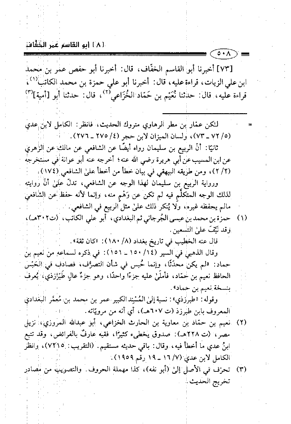73- أخبرنا أبو القاسم الخفاف قال أخبرنا أبو حفص عمر بن محمد بن علي الزيات قراءة عليه قال أخبرنا أبو علي حمزة بن محمد الكاتب قراءة عليه قال حدثنا نعيم بن حماد الخزاعي قال حدثنا أبو أمية -[509]- الثقفي عن سعيد بن أبي سعيد المقبري عن أبي هريرة قال قال رسول الله صلى الله عليه وسلم: " من بكر يوم الجمعة وابتكر وغسل واغتسل ومشى ولم يركب ودنا من الإمام واستمع وأنصت ولم يلغ حتى يصلي الجمعة كفاه الله تبارك وتعالى ما بينه وبين الجمعة الأخرى وزيادة ثلاثة أيام ".
