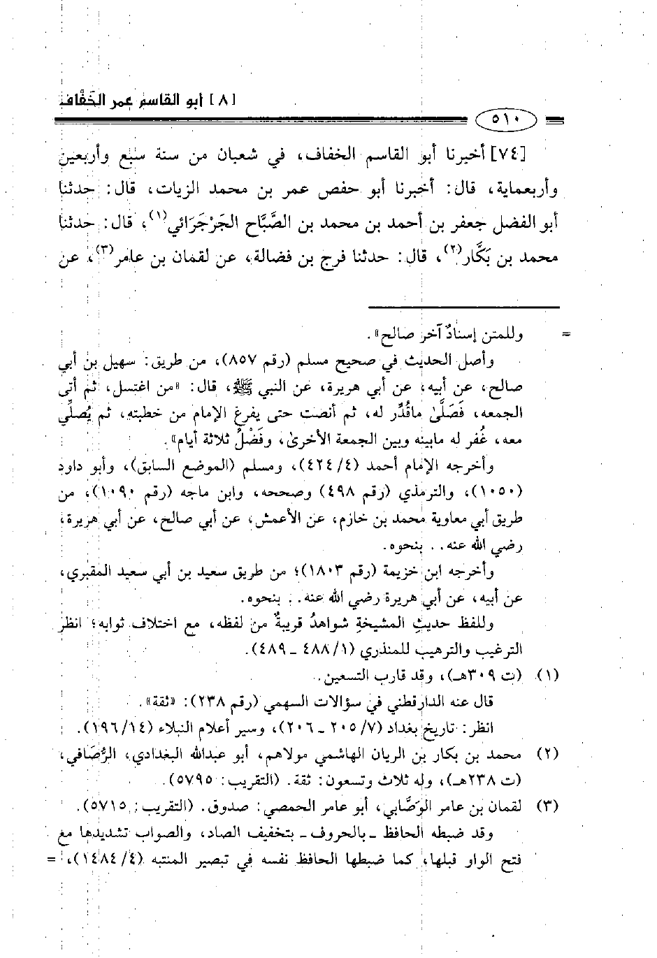 74- أخبرنا أبو القاسم الخفاف في شعبان من سنة سبع وأربعين وأربعمائة قال أخبرنا أبو حفص عمر بن محمد الزيات قال حدثنا أبو الفضل جعفر بن أحمد بن محمد بن الصباح الجرجرائي قال حدثنا محمد بن بكار قال حدثنا فرج بن فضالة عن لقمان بن عامر عن -[511]- أبي أمامة الباهلي عن النبي صلى الله عليه وسلم أنه قال: " اسمعوا لهم وأطيعوا في عسركم ويسركم ومنشطكم ومكرهكم وأثرة عليكم ولا تنازعوا الأمر أهله وإن كان لكم ".