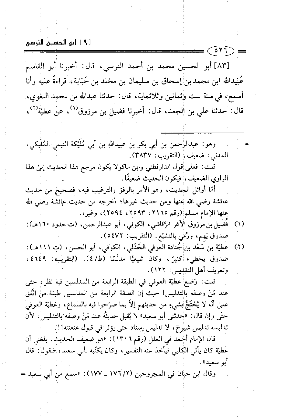 83- أبو الحسين محمد بن أحمد النرسي قال أخبرنا أبو القاسم عبيد الله بن محمد بن إسحاق بن سليمان بن مخلد بن حبابة قراءة عليه وأنا أسمع في سنة ست وثمانين وثلاثمائة قال حدثنا عبد الله بن محمد البغوي قال حدثنا علي بن الجعد قال أخبرنا فضيل بن مرزوق عن عطية -[527]- عن أبي سعيد قال قال رسول الله صلى الله عليه وسلم: " من صلى على جنازة وتبعها كان له قيراطان ومن صلى عليها ولم يتبعها كان له قيراط قيل يا رسول الله -[528]- وما القيراط؟ قال: مثل أحد ".