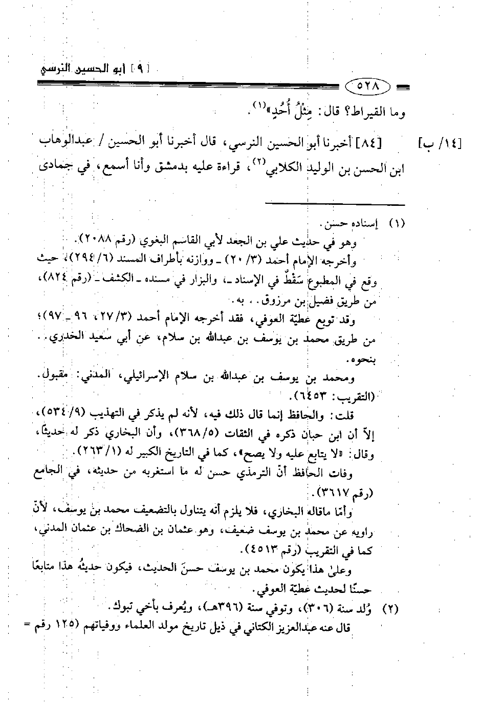 84- أخبرنا أبو الحسين النرسي قال أخبرنا أبو الحسين عبد الوهاب بن الحسن بن الوليد الكلابي قراءة عليه بدمشق وأنا أسمع في جمادى -[529]- الآخرة سنة ثلاث وتسعين وثلاثمائة قال أخبرنا أبو بكر محمد بن خريم بن محمد بن عبد الملك العقيلي قال حدثنا هشام بن عمار قال: حدثنا مالك بن أنس قال حدثني نافع عن عبد الله بن عمر رضي الله عنهما: أن رسول الله قطع سارقا في مجن قيمته ثلاثة دراهم.