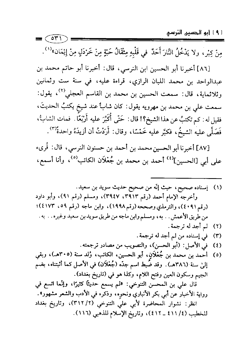 86- أخبرنا أبو الحسين ابن النرسي قال أخبرنا أبو حاتم محمد بن عبد الواحد بن محمد اللبان الرازي قراءة عليه في سنة ست وثمانين وثلاثمائة قال سمعت الحسين بن محمد بن القاسم العجلي يقول: سمعت علي بن محمد بن مهرويه يقول: كان شاب عند شيخ يكتب الحديث فقيل له: كم تكتب عن هذا الشيخ؟ قال: حتى أكبر عليه أربعا. فمات الشاب فصلى عليه الشيخ فكبر عليه خمسا وقال: أردت أن أزيده واحدة.