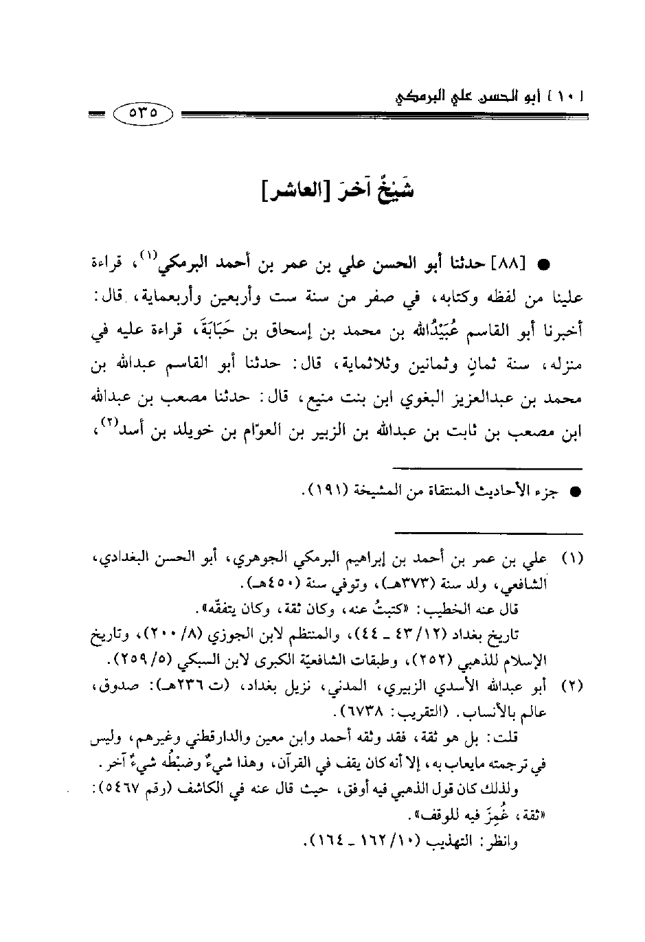 88- حدثنا أبو الحسن علي بن عمر بن أحمد البرمكي قراءة علينا من لفظه وكتابه في صفر من سنة ست وأربعين وأربعمائة قال أخبرنا أبو القاسم عبيد الله بن محمد بن إسحاق بن حبابة قراءة عليه في منزله سنة ثمان وثمانين وثلاثمائة قال حدثنا أبو القاسم عبد الله بن محمد بن عبد العزيز البغوي ابن بنت منيع قال حدثنا مصعب بن عبد الله بن مصعب بن ثابت بن عبد الله بن الزبير بن العوام بن خويلد بن أسد -[536]- إملاء في شعبان سنة ثمان وعشرين ومائتين قال حدثنا هشام بن عبد الله بن عكرمة المخزومي عن هشام بن عروة عن أبيه عن عائشة رضي الله عنها -[537]- أن رسول الله صلى الله عليه وسلم قال: " التمسوا الرزق في خبايا الأرض ".