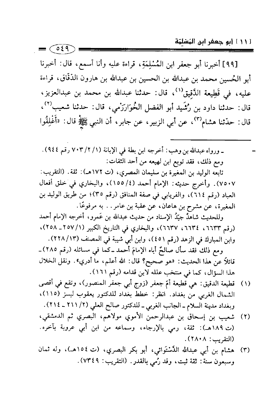 99- أخبرنا أبو جعفر بن المسلمة قراءة عليه وأنا أسمع قال أخبرنا أبو الحسين محمد بن عبد الله بن الحسين بن عبد الله بن هارون الدقاق قراءة عليه في قطيعة الدقيق قال حدثنا عبد الله بن محمد بن عبد العزيز قال حدثنا داود بن رشيد أبو الفضل الخوارزمي قال حدثنا شعيب قال حدثنا هشام عن أبي الزبير عن جابر أن النبي صلى الله عليه وسلم قال: " أغلقوا -[550]- الأبواب وأطفئوا السراج وأوكوا الأسقية وخمروا الطعام والشراب ولو أن تعرضوا عليه بعود ".