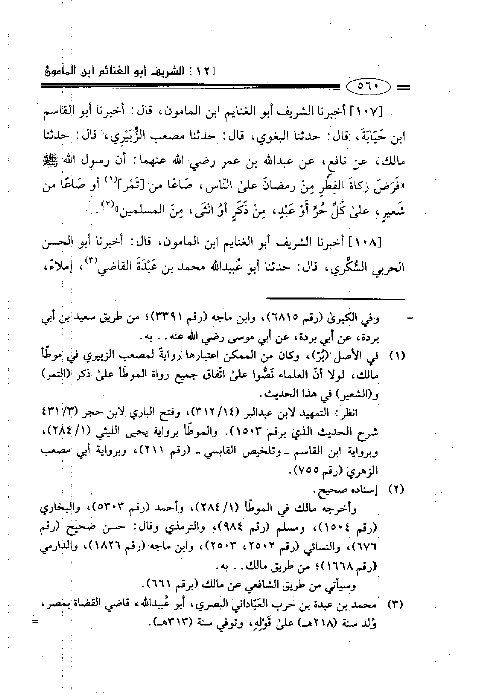 107- أخبرنا الشريف أبو الغنايم ابن المأمون قال أخبرنا أبو القاسم بن حبابة قال حدثنا البغوي قال حدثنا مصعب الزبيري قال حدثنا مالك عن نافع عن عبد الله بن عمر رضي الله عنهما أن رسول الله صلى الله عليه وسلم: " فرض زكاة الفطر من رمضان على الناس صاعا من تمر أو صاعا من شعير على كل حر أو عبد من ذكر أو أنثى من المسلمين ".