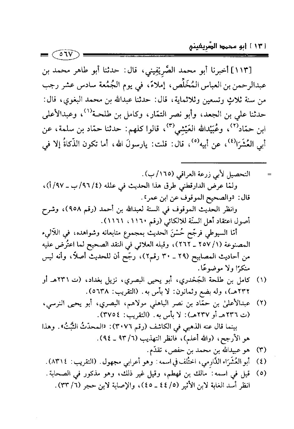 113- أخبرنا أبو محمد الصريفيني قال حدثنا أبو طاهر محمد بن عبد الرحمن بن العباس المخلص إملاء في يوم الجمعة سادس عشر رجب من سنة ثلاث وتسعين وثلاثمائة قال حدثنا عبد الله بن محمد البغوي قال حدثنا علي بن الجعد وأبو نصر التمار وكامل بن طلحة وعبد الأعلى بن حماد وعبيد الله العيشي قالوا كلهم: حدثنا حماد بن سلمة عن أبي العثرا عن أبيه قال قلت: يا رسول الله أما تكون الذكاة إلا في -[568]- الحلق واللبة؟ قال: " لو طعنت في فخذها لأجزاك ".