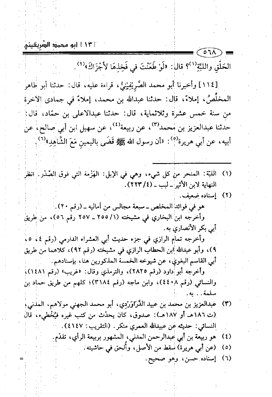 114- وأخبرنا أبو محمد الصريفيني قراءة عليه قال حدثنا أبو طاهر المخلص إملاء قال حدثنا عبد الله بن محمد إملاء في جمادي الآخرة من سنة خمس عشرة وثلاثمائة قال حدثنا عبد الأعلى بن حماد قال حدثنا عبد العزيز بن محمد عن ربيعة عن سهيل بن أبي صالح عن أبيه عن أبي هريرة: " أن رسول الله صلى الله عليه وسلم قضى باليمين مع الشاهد ".