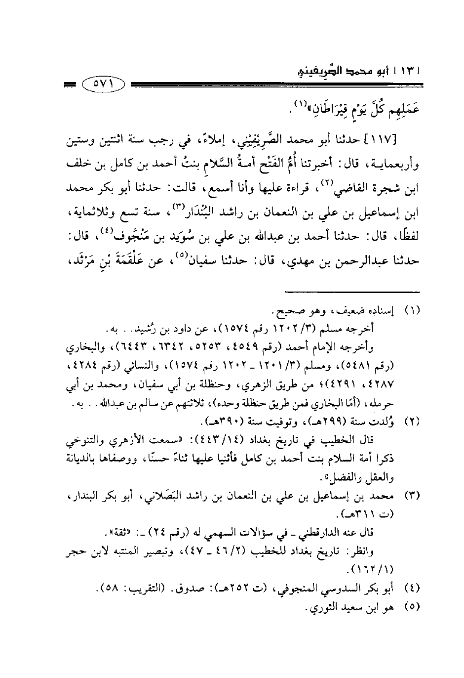 117- حدثنا أبو محمد الصريفيني إملاء في رجب سنة اثنتين وستين وأربعمائة قال أخبرتنا أم الفتح أمة السلام بنت أحمد بن كامل بن خلف بن شجرة القاضي قراءة عليها وأنا أسمع قالت: حدثنا أبو بكر محمد بن إسماعيل بن علي بن النعمان بن راشد البندار سنة تسع وثلاثمائة لفظا قال حدثنا أحمد بن عبد الله بن علي بن سويد بن منجوف قال حدثنا عبد الرحمن بن مهدي قال حدثنا سفيان عن علقمة بن مرثد -[572]- عن سليمان بن بريدة عن أبيه عن النبي صلى الله عليه وسلم قال: " من لعب بالنردشير فكأنما صبغ يده في لحم خنزير ودمه ".