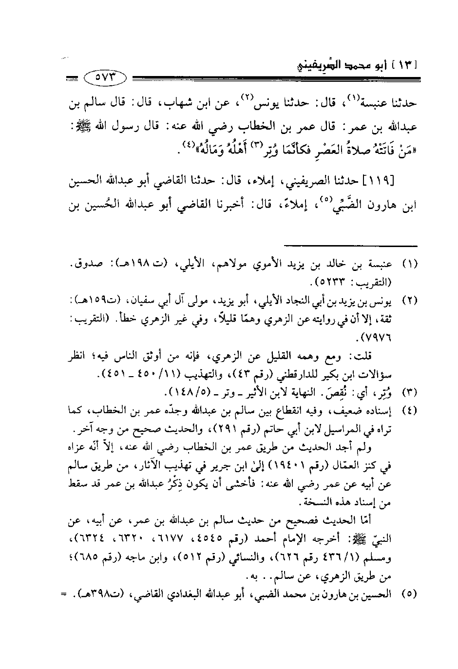 119- حدثنا الصريفيني إملاء قال حدثنا القاضي أبو عبد الله الحسين بن هارون الضبي إملاء قال أخبرنا القاضي أبو عبد الله الحسين بن -[574]- إسماعيل الضبي أن محمد بن إسماعيل البخاري حدثهم قال حدثني عبد العزيز بن عبد الله قال حدثني مالك عن صفوان بن سليم عن عطاء بن يسار عن أبي سعيد الخدري عن رسول الله صلى الله عليه وسلم قال: " إن أهل الجنة ليتراءون أهل الغرف من فوقهم كما ترون الكوكب الغابر في الأفق من المشرق أو المغرب لتفاضل ما بينهم. قالوا: يا رسول الله تلك منازل الأنبياء لا يبلغها غيرهم قال: بلى والذي نفسي بيده رجال آمنوا بالله وصدقوا المرسلين ".