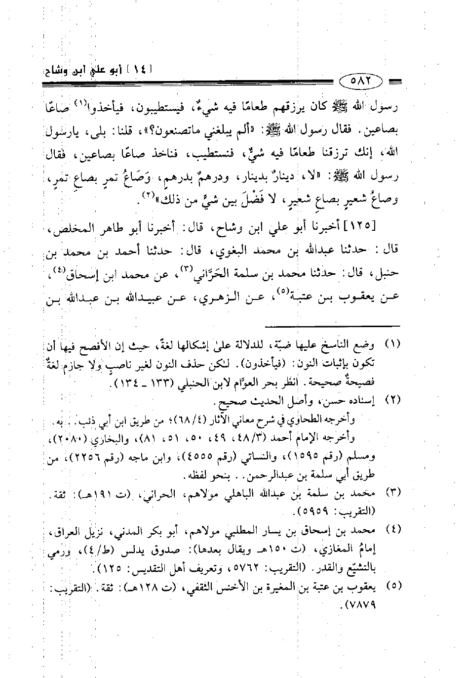 125- أخبرنا أبو علي ابن وشاح قال أخبرنا أبو طاهر المخلص قال حدثنا عبد الله بن محمد البغوي قال حدثنا أحمد بن محمد بن حنبل قال حدثنا محمد بن سلمة الحراني عن محمد بن إسحاق عن يعقوب بن عتبة عن الزهري عن عبيد الله بن عبد الله بن -[583]- عتبة عن عائشة رضي الله عنها قالت: رجع رسول الله صلى الله عليه وسلم ذات يوم من جنازة بالبقيع وأنا أجد صداعا في رأسي وأنا أقول: وارأساه! فقال: " بل أنا وارأساه ". ثم قال: " ما يضرك لو مت قبلي فكفنتك ثم صليت عليك ودفنتك "، قالت: كأني بك والله! لو قد فعلت ذلك لقد رجعت إلى بيتي فعرست فيه ببعض نسائك فتبسم رسول الله صلى الله عليه وسلم ثم بدىء به في وجعه الذي مات فيه.