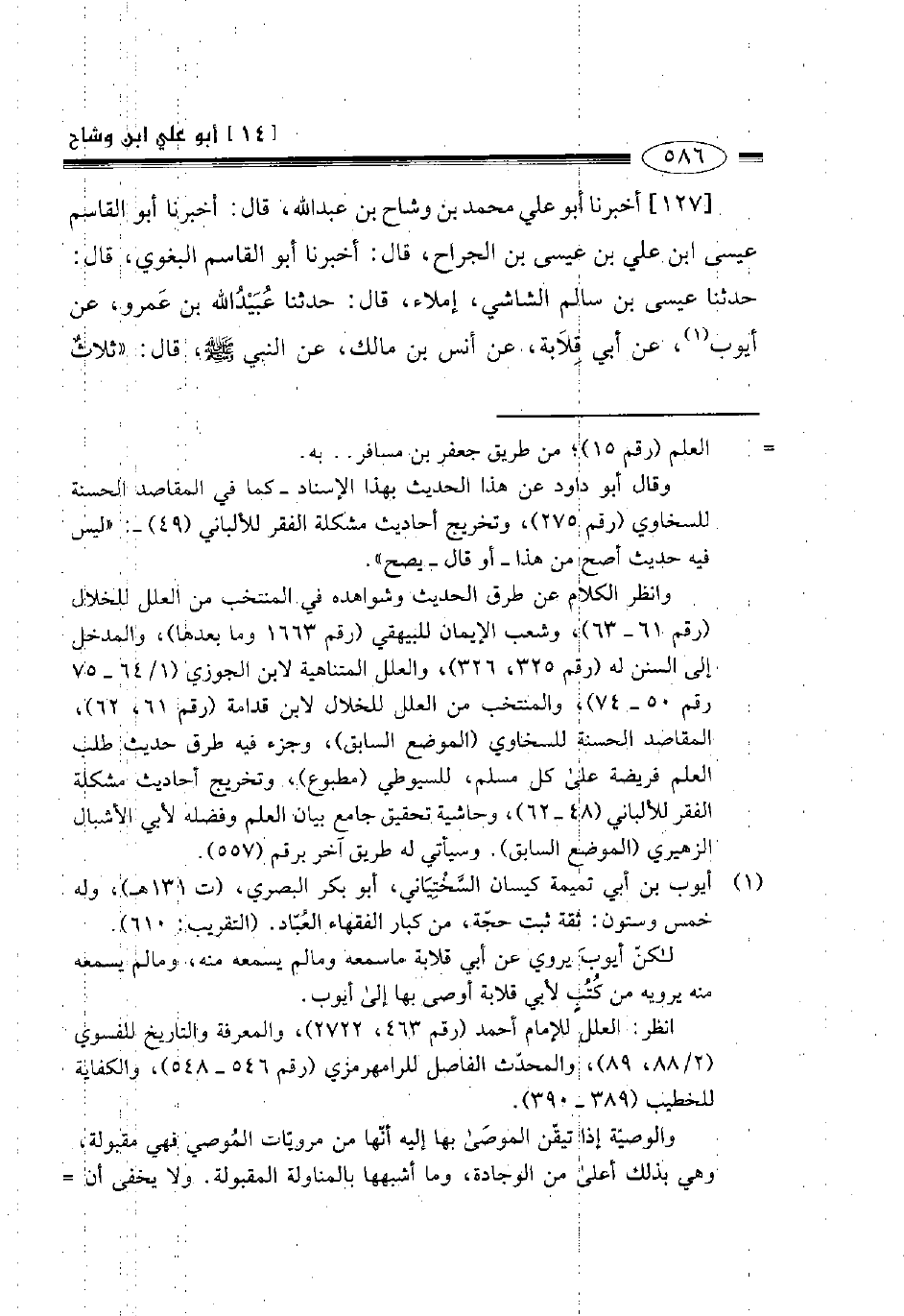 127- أخبرنا أبو علي محمد بن وشاح بن عبد الله قال أخبرنا أبو القاسم عيسى بن علي بن عيسى بن الجراح قال أخبرنا أبو القاسم البغوي قال حدثنا عيسى بن سالم الشاشي إملاء قال حدثنا عبيد الله بن عمرو عن أيوب عن أبي قلابة عن أنس بن مالك عن النبي صلى الله عليه وسلم قال: " ثلاث -[587]- من كن فيه وجد بهن حلاوة الإيمان: أن يكون الله ورسوله أحب إليه ممن سواهما أو يكون يكره أن يرجع في الكفر كما يكره أن يقذف في النار أو يحب المرء المسلم لا يحبه إلا لله عز وجل ".