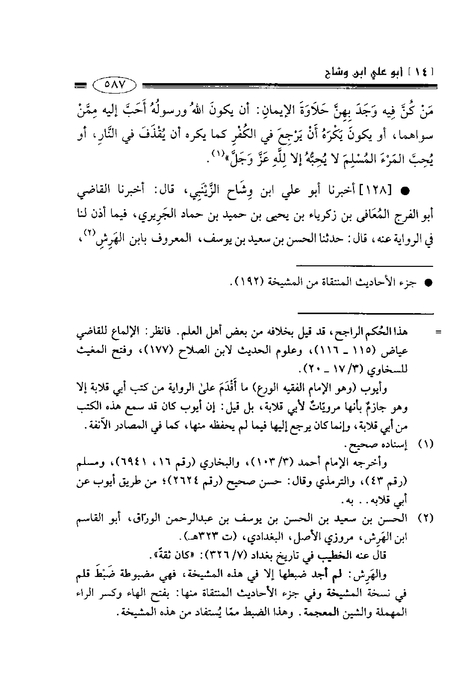 128- أخبرنا أبو علي ابن وشاح الزينبي قال أخبرنا القاضي أبو الفرج المعافي بن زكرياء بن يحيى بن حميد بن حماد الجريري فيما أذن لنا في الرواية عنه قال حدثنا الحسن بن سعيد بن يوسف المعروف بابن الهرش -[588]- قال حدثنا إسحاق بن إبراهيم البغوي قال حدثنا حسين بن محمد قال حدثنا شيبان عن منصور عن أبي عثمان مولى آل المغيرة بن شعبة قال سمعت أبا هريرة ونحن في مسجد الرسول صلى الله عليه وسلم يقول: قال رسول الله صلى الله عليه وسلم محمد أبو القاسم صاحب هذه الحجرة: " لا تنزع الرحمة إلا من شقي ".