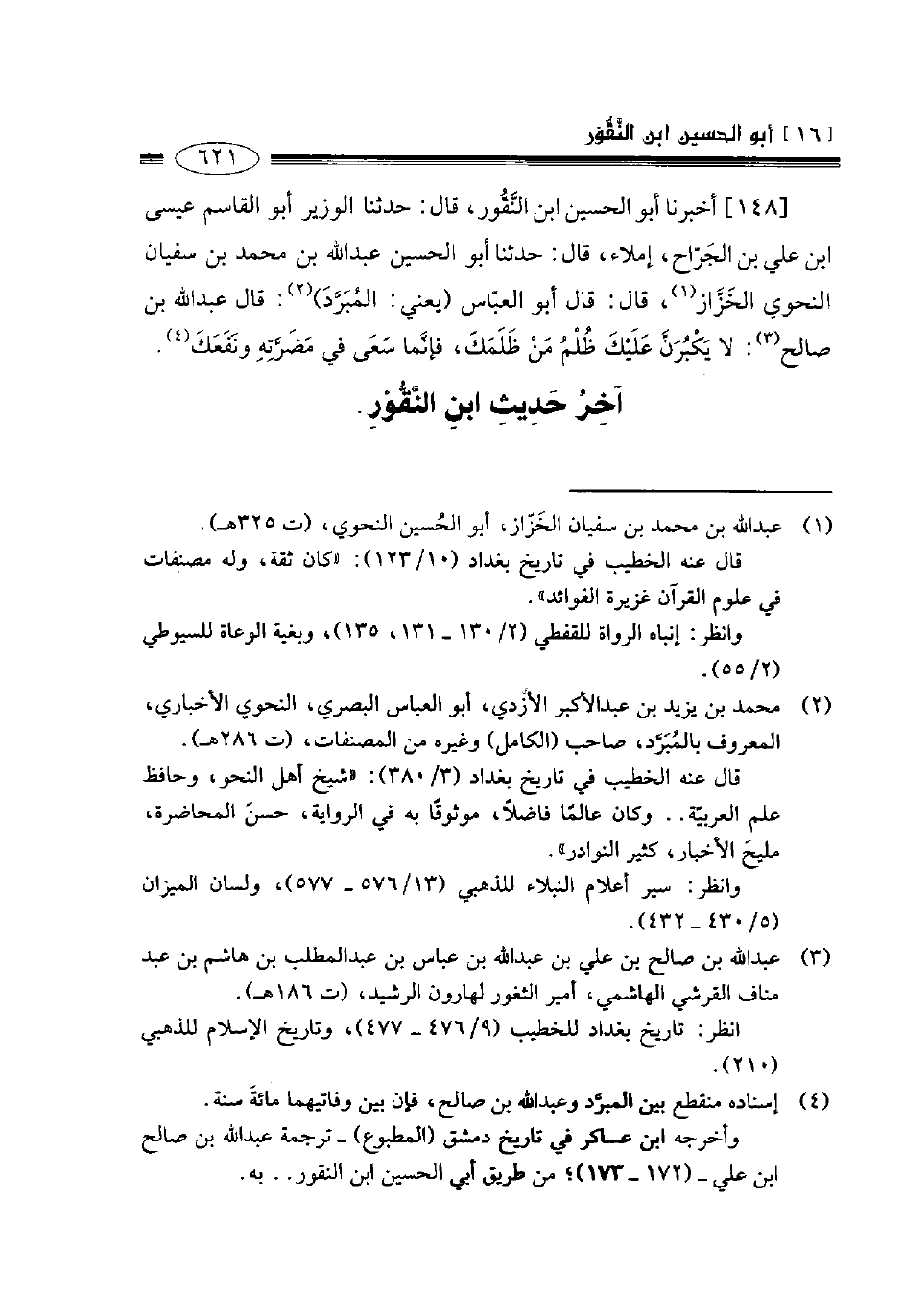 148- أخبرنا أبو الحسين ابن النقور قال حدثنا الوزير أبو القاسم عيسى بن علي بن الجراح إملاء قال حدثنا أبو الحسين عبد الله بن محمد بن سفيان النحوي الخزاز قال قال أبو العباس يعني المبرد قال عبد الله بن صالح: لا يكبرن عليك ظلم من ظلمك فإنما سعى في مضرته ونفعك.