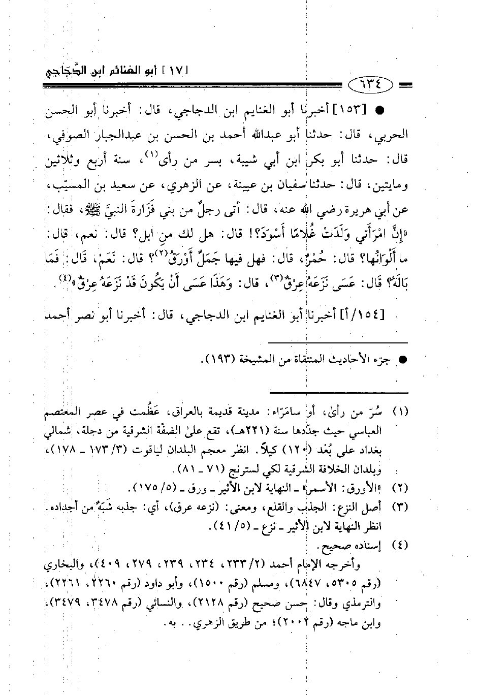 153- أخبرنا أبو الغنائم ابن الدجاجي قال أخبرنا أبو الحسن الحربي قال حدثنا أبو عبد الله أحمد بن الحسن بن عبد الجبار الصوفي قال حدثنا أبو بكر بن أبي شيبة بسر من رأى سنة أربع وثلاثين ومائتين قال حدثنا سفيان بن عيينة عن الزهري عن سعيد بن المسيب عن أبي هريرة رضي الله عنه قال أتى رجل من بني فزارة النبي صلى الله عليه وسلم فقال: " إن امرأتي ولدت غلاما أسود؟ قال: هل لك من إبل؟ قال: نعم قال: ما ألوانها؟ قال: حمر قال: فهل فيها جمل أورق؟ قال: نعم، قال: فما باله؟ قال: عسى نزعه عرق، قال: وهذا عسى أن يكون قد نزعه عرق ".