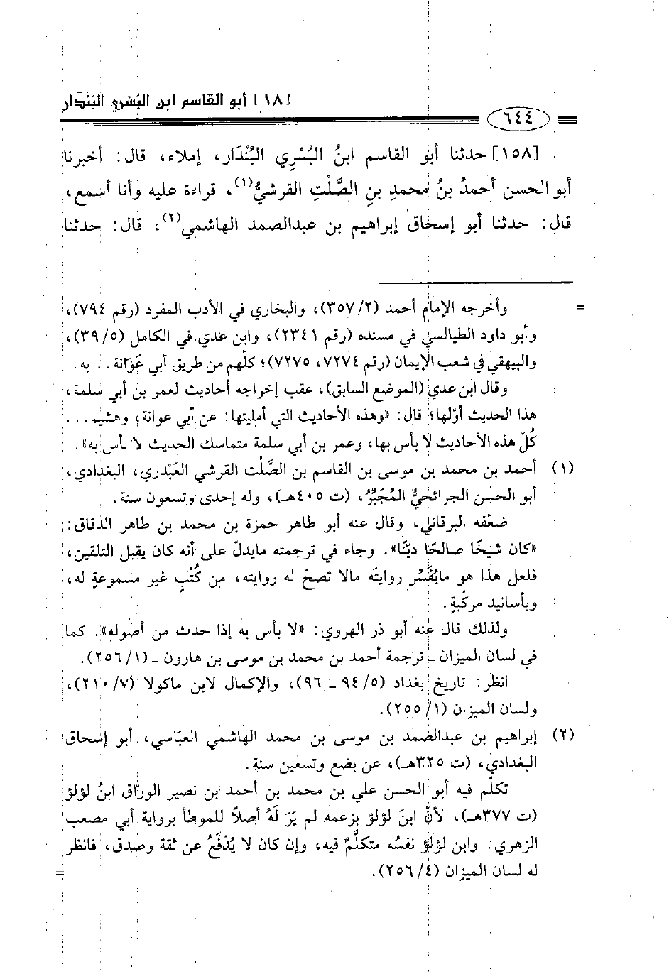 158- حدثنا أبو القاسم ابن البسري البندار إملاء قال أخبرنا أبو الحسن أحمد بن محمد بن الصلت القرشي قراءة عليه وأنا أسمع قال حدثنا أبو إسحاق إبراهيم بن عبد الصمد الهاشمي قال حدثنا -[645]- محمد بن عبد الله بن يزيد المقرئ قال حدثنا أبي قال حدثنا حيوة قال حدثنا أبو صخر أنه سمع يزيد الرقاشي يقول: سمعت أنس بن مالك رضي الله عنه يقول: سمعت رسول الله صلى الله عليه وسلم يقول: " إن الله ليستحي إذا رفع العبد إليه يديه أن يردهما صفرا ليس فيهما شيء ".