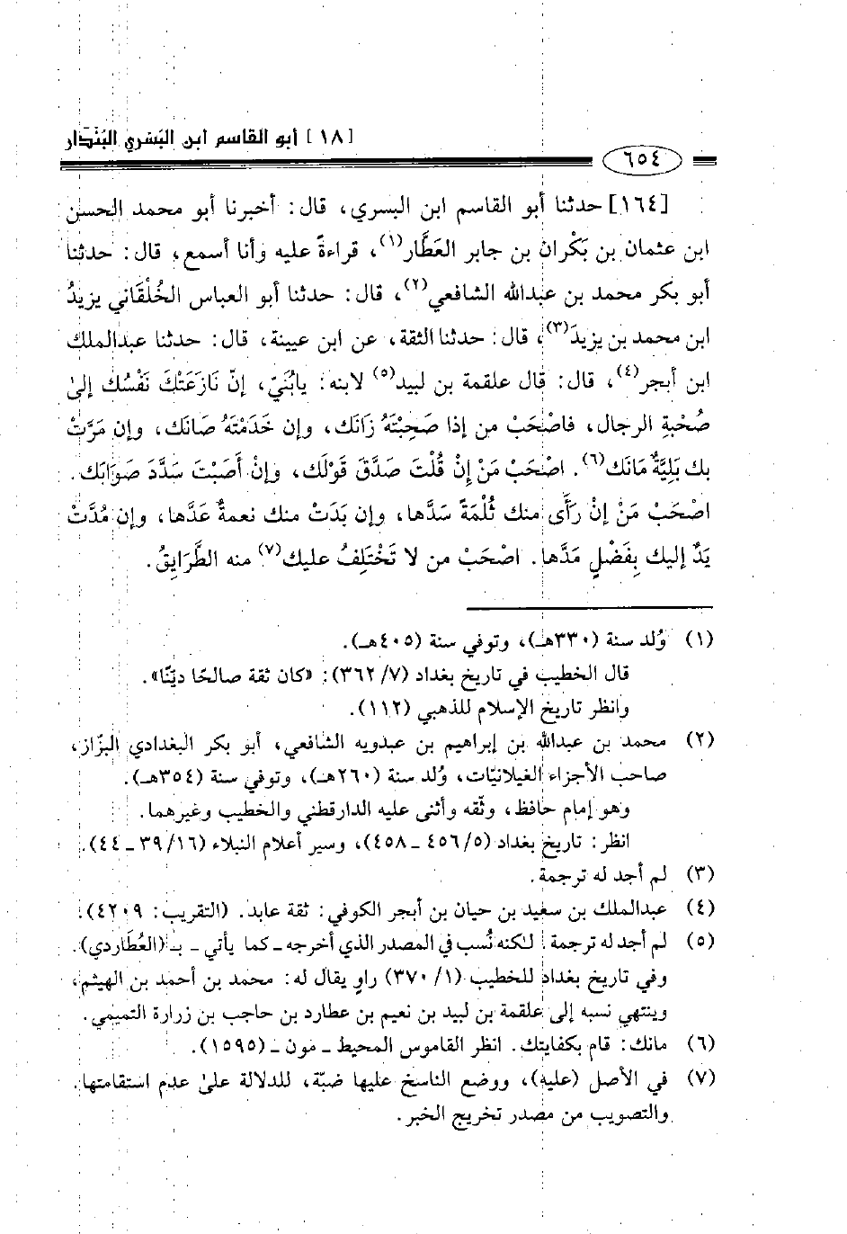 164- حدثنا أبو القاسم ابن البسري قال أخبرنا أبو محمد الحسن بن عثمان بن بكران بن جابر العطار قراءة عليه وأنا أسمع قال حدثنا أبو بكر محمد بن عبد الله الشافعي قال حدثنا أبو العباس الخلقاني يزيد بن محمد بن يزيد قال حدثنا الثقة عن ابن عيينة قال حدثنا عبد الملك بن أبجر قال قال علقمة بن لبيد لابنه: يا بني إن نازعتك نفسك إلى صحبة الرجال فاصحب من إذا صحبته زانك وإن خدمته صانك وإن مرت بك بلية مانك. اصحب من إن قلت صدق قولك وإن أصبت سدد صوابك. اصحب من إن رأى منك ثلمة سدها وإن بدت منك نعمة عدها، وإن مدت يد إليك بفضل مدها. اصحب من لا تختلف عليك منه الطرائق.