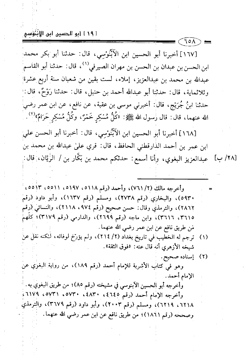 167- أخبرنا أبو الحسين بن الآبنوسي قال حدثنا أبو بكر محمد بن الحسن بن عبدان بن الحسن بن مهران الصيرفي قال حدثنا أبو القاسم عبد الله بن محمد بن عبد العزيز إملاء لست بقين من شعبان سنة أربع عشرة وثلاثمائة قال حدثنا أبو عبد الله أحمد بن حنبل قال حدثنا روح قال حدثنا ابن جريج قال أخبرني موسى بن عقبة عن نافع عن ابن عمر رضي الله عنهما قال قال رسول الله صلى الله عليه وسلم: " كل مسكر خمر وكل مسكر حرام ".
