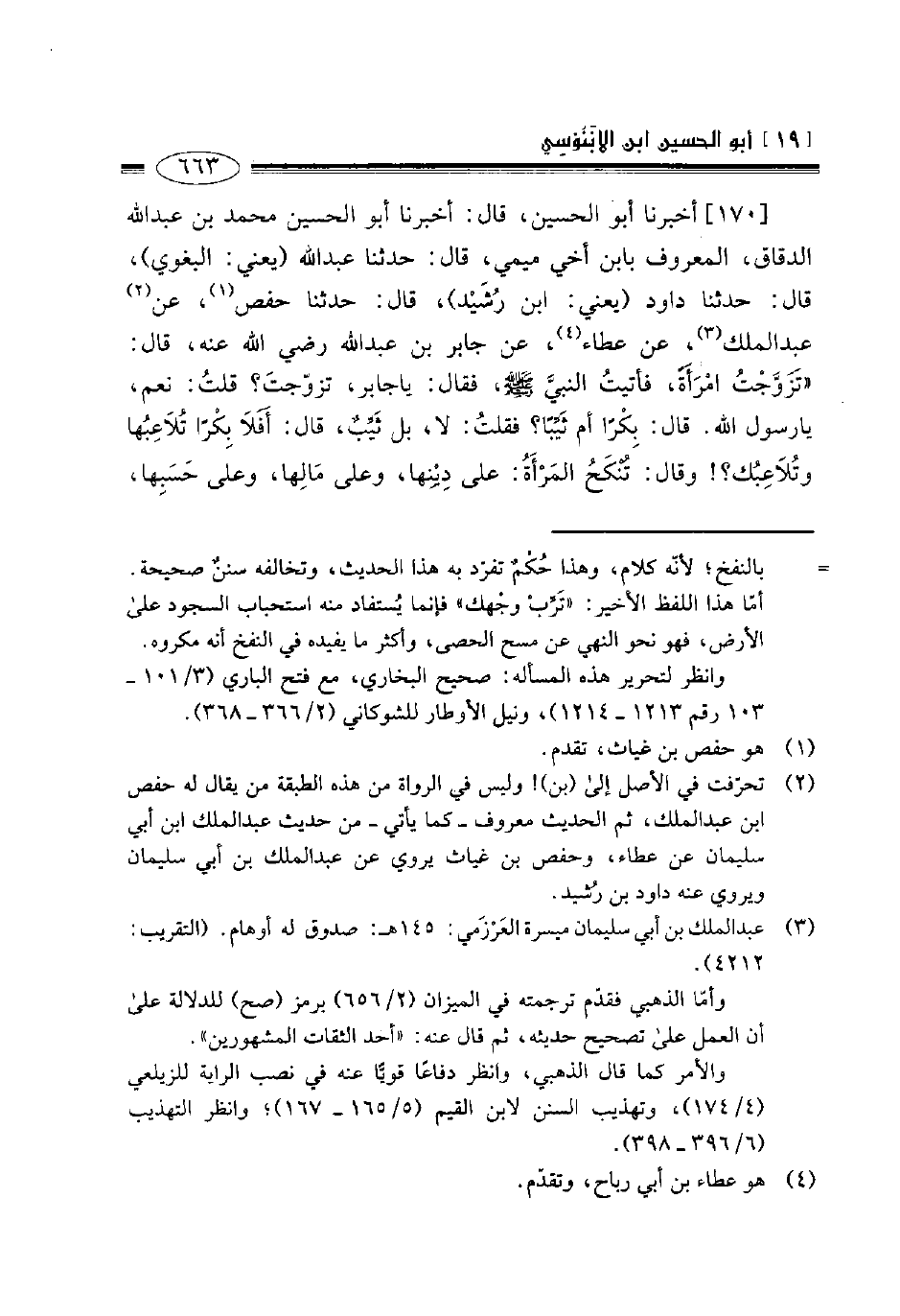 170- أخبرنا أبو الحسين قال أخبرنا أبو الحسين محمد بن عبد الله الدقاق المعروف بابن أخي ميمي قال حدثنا عبد الله يعني البغوي قال حدثنا داود يعني ابن رشيد قال حدثنا حفص عن عبد الملك عن عطاء عن جابر بن عبد الله رضي الله عنه قال: تزوجت امرأة فأتيت النبي صلى الله عليه وسلم فقال: يا جابر تزوجت؟ قلت: نعم يا رسول الله. قال: بكرا أم ثيبا؟ فقلت: لا بل ثيب، قال: أفلا بكرا تلاعبها وتلاعبك؟ وقال: تنكح المرأة: على دينها وعلى مالها وعلى حسبها -[664]- وعلى كمالها فاظفر بذات الدين تربت يداك ".