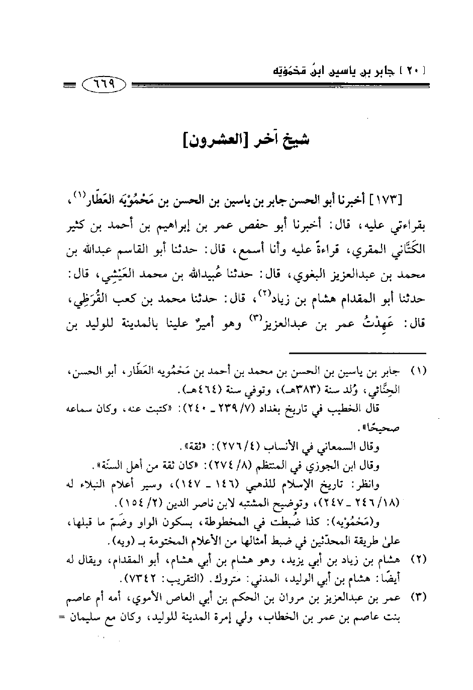173- أخبرنا أبو الحسن جابر بن ياسين بن الحسن بن محمويه العطار بقراءتي عليه قال أخبرنا أبو حفص عمر بن إبراهيم بن أحمد بن كثير الكتاني المقرئ قراءة عليه وأنا أسمع قال حدثنا أبو القاسم عبد الله بن محمد بن عبد العزيز البغوي قال حدثنا عبيد الله بن محمد العيشي قال حدثنا أبو المقدام هشام بن زياد قال حدثنا محمد بن كعب القرظي قال عهدت عمر بن عبد العزيز وهو أمير علينا بالمدينة للوليد بن -[670]- عبد الملك وهو شاب غليظ ممتليء الجسم. فلما استخلف أتيته لخناصرة فدخلت عليه وقد قاسى ما قاسى فإذا هو قد تغيرت حاله عما كان فجعلت أنظر إليه لا أكاد أصرف بصري عنه. فقال: إنك لتنظر إلي نظرا ما كنت تنظره إلي من قبل يا ابن كعب؟! قال: قلت: تعجبني، قال: فما أعجبك؟ قلت: لما حال لونك ونفى من شعرك ونحل من جسدك قال: فقال: كيف لو رأيتني في قبري؟! وفمي بعد ثلاث صديدا ودودا كنت مني أشد نكرة. ثم قال لي: أعد علي حديثا حدثتنيه عن ابن عباس؟ قال: قلت: حدثني ابن عباس أن رسول الله صلى الله عليه وسلم قال: " إن لكل شيء شرفا وإن أشرف المجالس ما استقبل به القبلة. وإنما تجالسون بالأمانة ولا تصلوا خلف النائم ولا المتحدث. واقتلوا الحية والعقرب -[671]- وإن كنتم في صلاتكم. ولا تستروا الجدر بالثياب. ومن نظر في كتاب أخيه بغير إذنه فكأنما ينظر في النار ومن أحب أن يكون أقوى الناس فليتوكل على الله ومن أحب أن يكون أكرم الناس فليتق الله عز وجل ومن أحب أن يكون أغنى الناس فليكن بما في يدي الله أوثق منه بما في يده ألا أنبئكم بشراركم؟ قالوا: نعم يا رسول الله قال: من يبغض الناس ويبغضونه. قال: أفأنبئكم بشر من هذا؟ قالوا: نعم يا رسول الله، قال: من لا يقيل عثرة ولا يغفر ذنبا. أفأنبئكم بشر من هذا؟ قالوا: نعم يا رسول الله قال: من لا يرجى خيره ولا يؤمن شره.