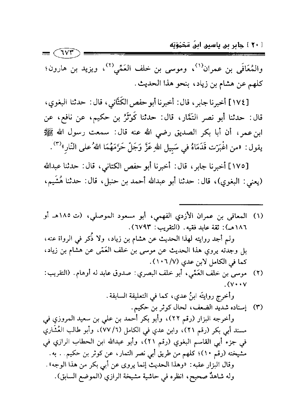 174- أخبرنا جابر قال أخبرنا أبو حفص الكتاني قال حدثنا البغوي قال حدثنا أبو نصر التمار قال حدثنا كوثر بن حكيم عن نافع عن ابن عمر أن أبا بكر الصديق رضي الله عنه قال سمعت رسول الله صلى الله عليه وسلم يقول: " من اغبرت قدماه في سبيل الله عز وجل حرمهما الله على النار ".