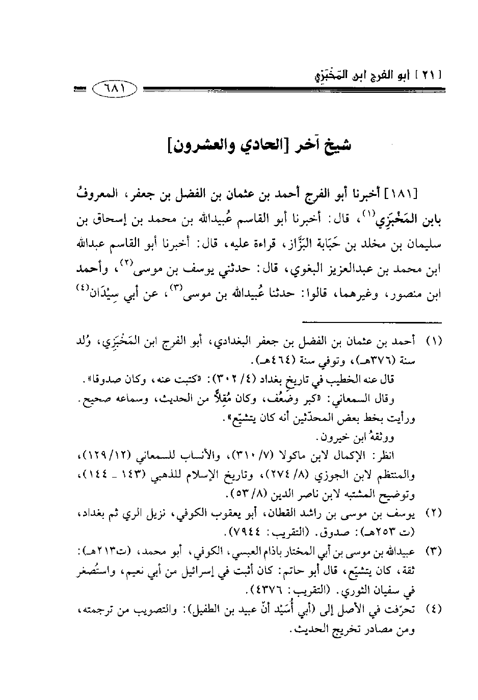 181- أخبرنا أبو الفرج أحمد بن عثمان بن الفضل بن جعفر المعروف بابن المخبزي قال أخبرنا أبو القاسم عبيد الله بن محمد بن إسحاق بن سليمان بن مخلد بن حبابة البزاز قراءة عليه قال أخبرنا أبو القاسم عبد الله بن محمد بن عبد العزيز البغوي قال حدثني يوسف بن موسى وأحمد بن منصور وغيرهما قالوا: حدثنا عبيد الله بن موسى عن أبي سيدان -[682]- عبيد بن الطفيل قال حدثني ربعي بن حراش عن عثمان رضي الله عنه أنه خطب إلى عمر ابنته فرده فبلغ ذلك النبي صلى الله عليه وسلم فلما راح إليه عمر قال: " يا عمر أدلك على ختن خير لك من عثمان وأدل عثمان على ختن خير له منك؟ قال: نعم، يا نبي الله قال: زوجني ابنتك وأزوج عثمان ابنتي ".