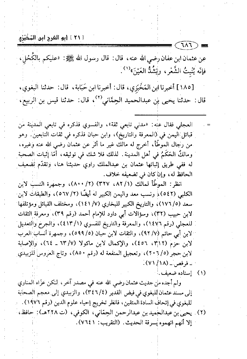 185- أخبرنا ابن المخبزي قال أخبرنا ابن حبابة قال حدثنا البغوي قال حدثنا يحيى بن عبد الحميد الحماني قال حدثنا قيس بن الربيع -[687]- عن علقمة عن سعد بن عبيدة عن أبي عبد الرحمن عن عثمان رضي الله عنه قال قال النبي صلى الله عليه وسلم: " خيركم من تعلم القرآن وعلمه ".