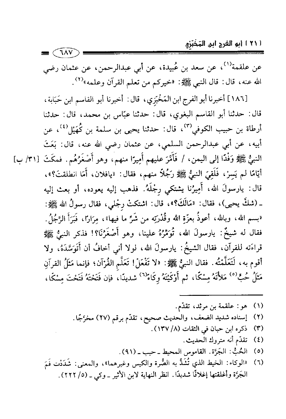 186- أخبرنا أبو الفرج ابن المخبزي قال أخبرنا أبو القاسم ابن حبابة قال حدثنا أبو القاسم البغوي قال حدثنا عباس بن محمد قال حدثنا أرطاة بن حبيب الكوفي قال حدثنا يحيى بن سلمة بن كهيل عن أبيه عن أبي عبد الرحمن السلمي عن عثمان رضي الله عنه قال: بعث النبي صلى الله عليه وسلم وفدا إلى اليمن فأمر عليهم أميرا منهم وهو أصغرهم فمكث أياما لم يسر فلقي النبي صلى الله عليه وسلم رجلا منهم فقال: " يا فلان أما انطلقت؟ " قال: يا رسول الله أميرنا يشتكي رجله. فذهب إليه يعوده أو بعث إليه شك يحيى، فقال: " مالك؟ " قال: اشتكت رجلي فقال رسول الله صلى الله عليه وسلم: " بسم الله وبالله أعوذ بعزة الله وقدرته من شر ما فيها " مرارا فبرأ الرجل. فقال له شيخ: يا رسول الله تؤمره علينا وهو أصغرنا؟ فذكر النبي صلى الله عليه وسلم قراءته للقرآن فقال الشيخ: يا رسول الله لولا أني أخاف أن أتوسده ولا أقوم به لتعلمته. فقال النبي صلى الله عليه وسلم: " لا تفعل! تعلم القرآن فإنما مثل القرآن مثل حب ملأته مسكا ثم أوكيته وكاء شديدا فإن فتحته فتحت مسكا -[688]- وإن تركته تركت مسكا فذلك مثل القرآن إن قرأت به وإلا كان في صدرك ".