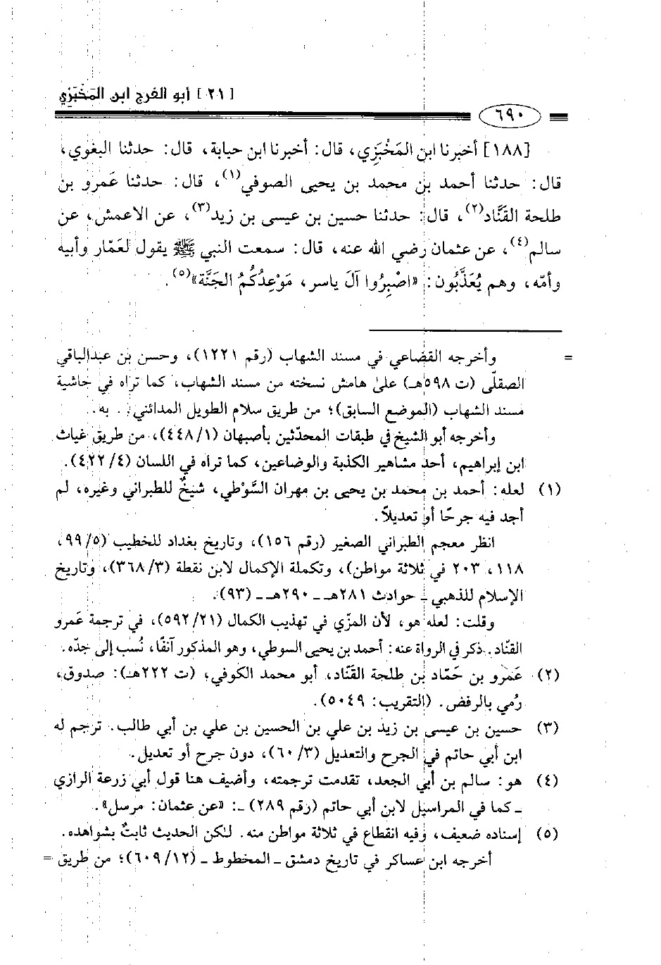 188- أخبرنا ابن المخبزي قال أخبرنا ابن حبابة قال حدثنا البغوي قال حدثنا أحمد بن محمد بن يحيى الصوفي قال حدثنا عمرو بن طلحة القناد قال حدثنا حسين بن عيسى بن زيد عن الأعمش عن سالم عن عثمان رضي الله عنه قال سمعت النبي صلى الله عليه وسلم يقول لعمار وأبيه وأمه وهم يعذبون: " اصبروا آل ياسر موعدكم الجنة ".