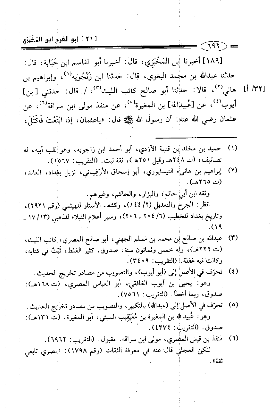 189- أخبرنا ابن المخبزي قال أخبرنا أبو القاسم ابن حبابة قال حدثنا عبد الله بن محمد البغوي قال حدثنا ابن زنجويه وإبراهيم بن هانىء قالا حدثنا أبو صالح كاتب الليث قال حدثني ابن أيوب عن عبيد الله بن المغيرة عن منقذ مولى ابن سراقة عن عثمان رضي الله عنه أن رسول الله صلى الله عليه وسلم قال: " يا عثمان إذا ابتعت فاكتل -[693]- وإذا بعت فكل ".
