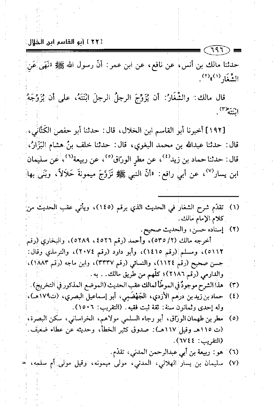 192- أخبرنا أبو القاسم ابن الخلال قال حدثنا أبو حفص الكتاني قال حدثنا عبد الله بن محمد البغوي قال حدثنا خلف بن هشام البزار قال حدثنا حماد بن زيد عن مطر الوراق عن ربيعة عن سليمان بن يسار عن أبي رافع: " أن النبي صلى الله عليه وسلم تزوج ميمونة حلال وبنى بها -[697]- حلالا وكنت الرسول بينهما ".