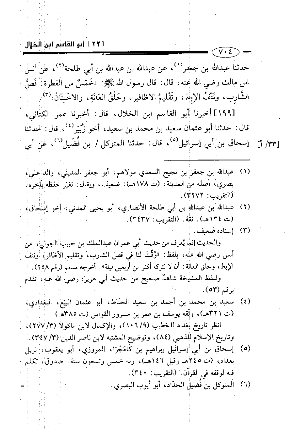 199- أخبرنا ابو القاسم ابن الخلال قال أخبرنا عمر الكتاني قال حدثنا أبو عثمان سعيد بن محمد بن سعيد أخو زبير قال حدثنا إسحاق بن أبي إسرائيل قال حدثنا المتوكل بن فضيل عن أبي -[705]- ظلال عن أنس قال قال رسول الله صلى الله عليه وسلم: " لو أن أهل السموات السبع وأهل الأرضين السبع اجتمعوا على قتل امرىء مسلم لأرداهم الله النار على مناخرهم ".